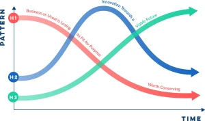 The Three Horizons Framework is a strategic tool for thinking about the future and managing change over time. It presents three overlapping patterns over time: