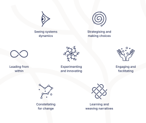 Reworking the capabilities has posed some interesting questions. We felt a tension between the language we commonly use to articulate change processes — strategy, innovation, leadership, learning, collaboration — and the more dynamic, relational and qualitative ways of being and doing. We wanted the renewed capabilities to express how change work is not just about what is out there in the world, but how it also involves inner work, leadership from within, the underlying role of engaging and facilitating others, and the often deprioritised work of how we constellate — the way we come together to create change, how we organise and govern this work that is so much about people.
