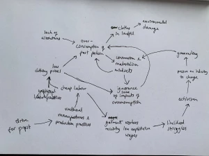 Before this piece of research I had only heard of ‘system change’ on banners at climate rallies, stating ‘system change NOT climate change’. Although I was new to the theory, the system ‘lens’ made a lot of sense in my head and helped rekindle my hope for the future of fashion. My dissertation ended up evaluating what the role of SFS could look like as a facilitator of change in Scotland’s fashion community. From this I recommended 5 guiding principles for organisations looking to facilitate collective community action (underpinned by an equity lens), which we use today at SFS to guide our agile actions. During the research project I stumbled across Forum for the Future and the School of System Change, attended a Basecamp information session in late June, applied to the course, submitted my dissertation in August (3 minutes before the deadline), and started Basecamp in September to continue to build my systems knowledge and practice!