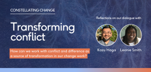 This session invited two old-time friends and colleagues Leonie Smith and Kazu Haga to open up their ongoing dialogue about transformative conflict. Both Kazu and Leonie shared how working with difference can enable the ways in which we organise for change. By building our individual and collective capacity to work productively with conflict, we can sew the seeds of new systems of restoration that support healing and different ways of being and collaborating together.